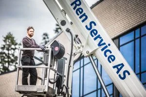Ren Service AS anser sikkerhet som svært viktig når vi utfører våre oppgaver som her ved rengjøring av fasade.